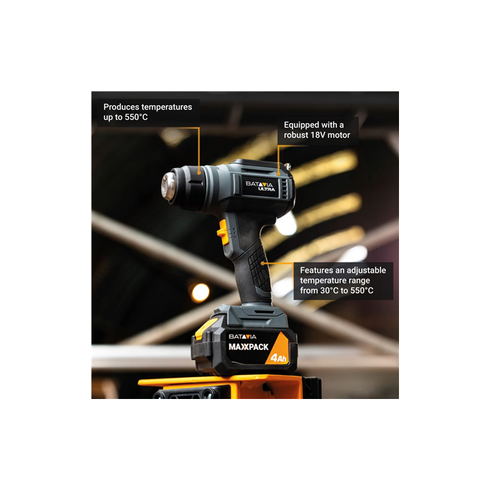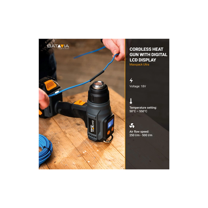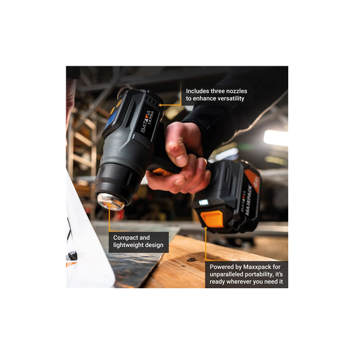 | Muud funktsioonid | Powerful 18V motor for reliable and efficient heating; Digital LCD Display for precise temperature and airflow control; Adjustable temperature range (30°C - 550°C) for versatile applications; Lightweight & ergonomic design for comfortable handling; Includes three nozzles for specialized heating tasks; Cordless design with Maxxpack compatibility for ultimate flexibility |
