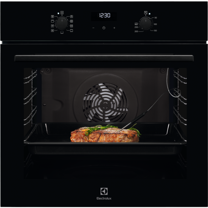 Elektroonilised ahju funktsioonid: helisignaal, kestvuse näit, lõpu näit, toidutermomeetri automaatne väljalülitamine, minutilugeja, aja näit.