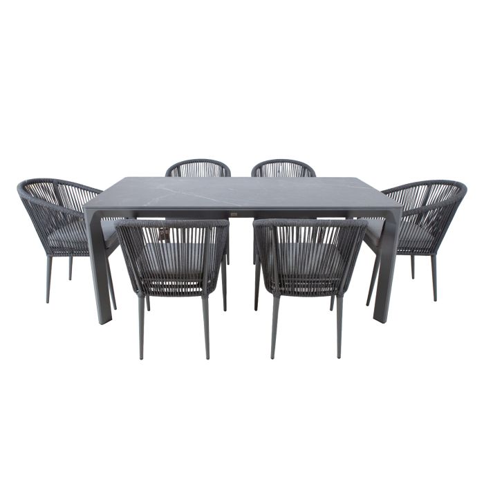 Aiamööblikomplekt CARVES laud ja 6 tooli. Laua mõõdud on 180x90xH75cm, lauaplaadi paksud 11mm. Jalad ja raam on valmistatud alumiiniumist (48x25x1,2mm) ja viimistletud halli pulbervärviga. Paagutatud kivist (sintered stone) lauaplaadi valmistamisel on kasutatud innovatiivset tehnoloogiat, mis jäljendab loodusliku kivi moodustumise protsessi sügaval maakoores. Kaoliini ehk portselansavi osakesed töödeldakse 1200 kraadises kuumuses, mille tulemusena moodustub materjal, mis oma omadustel ja välimuselt sarnaneb naturaalse kiviga. Lauaplaat on küll õhuke, kuid väga tugev (suhteline kõvadus Mohsi skaalal 7), kulumiskindel, talub hästi kõrget temperatuuri ja erinevaid ilmastikutingimusi, ei ima plekke ja seda on väga lihtne puhastada ja hooldada. Kuna keemilisi sideaineid ei ole kasutatud on materjal hügieeniline. TÄHELEPANU! Vältige lööke, põrutusi ja kukkumist. Tooli raam ja jalad on valmistatud alumiiniumist ja viimistletud halli pulbervärviga. Tooli selja- ja käetoed on kaetud nöörpunutisega. Istmepadi kuulub komplekti. Padjakate on valmistatud polüesterkangast. Padja mõõdud 45x42x5cm. Istmepõhi on toestatud alumiiniumliistudega. Tooli mõõdud on 57x65xH81cm, istmekõrgus 44cm. Kaalupiirang 100kg. Toolid on virnastatavad ning nende hoiustamine on lihtne ja ruumi säästev. HOIUSTAMINE: suvehooaja lõppedes soovitame aiamööblit hoiustada siseruumides. Puhastage ja kuivatage mööbel enne hoiule panekut. Kasutage hoiustamiseks jahedat, kuiva ning hea ventilatsiooniga.