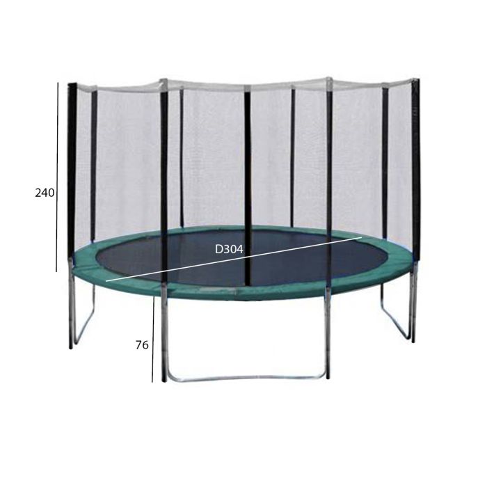Batuut turvavõrguga D304cm, rohelise äärega. Batuut on tore võimalus värskes õhus aktiivseks ajaveetmiseks kogu perele. Batuudi kõrgus maast on 76cm. Elastne ja vastupidav hüppematt on valmistatud musta värvi polüpropeenist. Turvaääre pealmine kiht on valmistatud rohelisest PVC materialist, alumine pool on polüetüleenkangas. Kahe kihi vahel on 15+6mm polüetüleenvahust pehmendus. Turvaääre laius on 27cm. Batuudi raam ja jalad on valmistatud galvaniseeritud terastorust D38x1,5mm. Batuudil on 64 vedru - 138mm/D23,5x3,2mm. Turvavõrk on valmistatud mustast polüestervõrgust. Sissepääsuava on tõmblukuga suletav. Komplekti kuulub kaheksa vahtplastist pehmendustega tugiposti. Postid on valmistatud galvaniseeritud terastorust D25,4x1,1mm. Võrgu üldkõrgus on 256cm, kõrgus batuudi äärest on 180cm. Kaalupiirang 180kg. Pika kasutusaja ja ilmastikutingimuste mõjul kulunud batuudi osad on võimalik välja vahetada. Varuosadena on saadaval, turvavõrk, turvaäär, hüppamismatt ja batuudivedrud. HOIUSTAMINE: batuudi eluea pikendamiseks soovitame see suvehooaja lõppedes lahti monteerida ja hoiustada kuivas, hea ventilatsiooniga ruumis. Puhastage ja kuivatage matt ja turvaäär enne hoiule panekut.