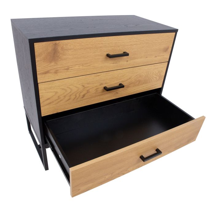 Kummut AMSTERDAM 80x40xH75cm. Materjal: melamiinplaat, värvus: tamm/must. Must metallist alusraam. Vaikselt sulguvad hinged ja sahtlisiinid. Mustad alumiiniumust käepidemed.