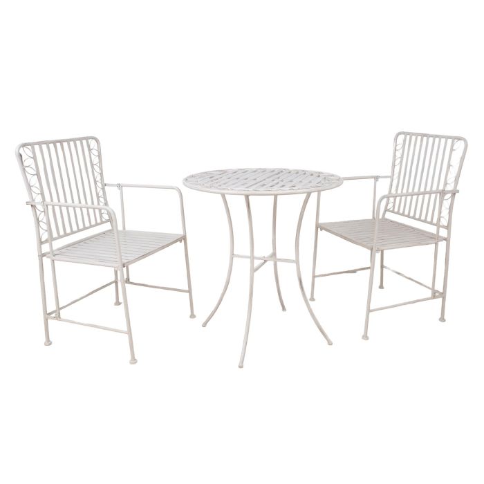 Rõdukomplekt JASMINE laud ja 2 tooli, antiikvalge metall. Laua mõõdud on D70xH75cm. Tooli üldmõõdud on 54x53xH92cm. Istme laius 49cm, istme sügavus 42cm, istme kõrgus 44cm. Käetoe kõrgus maast 68cm. Kaalupiirang 100kg. HOOLDUS JA HOIUSTAMINE: metallist mööbel on praktiliselt hooldusvaba, piisab regulaarsest puhastamisest. Suvehooaja lõppedes soovitame aiamööblit hoiustada siseruumides. Puhastage ja kuivatage mööbel enne hoiule panekut. Kasutage hoiustamiseks kuiva ning hea ventilatsiooniga ruumi.