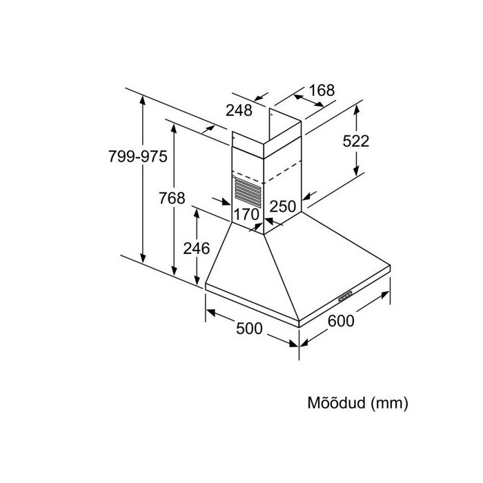 Seinale paigaldatav õhupuhastaja, 60 cm laiune, kasutatav aktiivsöefiltriga või ühendatav väljatõmbekanalisse, nõudepesumasinas pestav metall-rasvafilter, LED valgustus, max 365 m³/h, 66 dB, 3 võimsusastet.