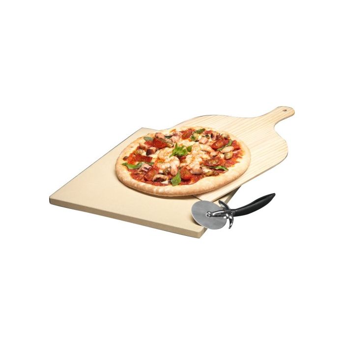 Pitsaküpsetuskomplekt: küpsetuskivi, lõikur ja labidas.